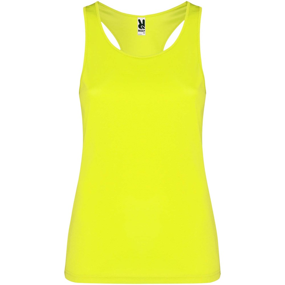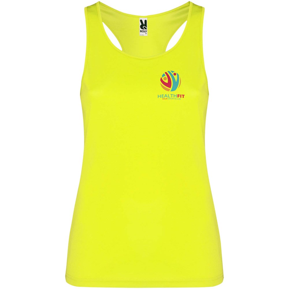 Technische, ademende, gemakkelijk te wassen en te drogen stof. Geribde armsgaten en halslijn. Racerback en zijnaden. Verwijderbaar label.