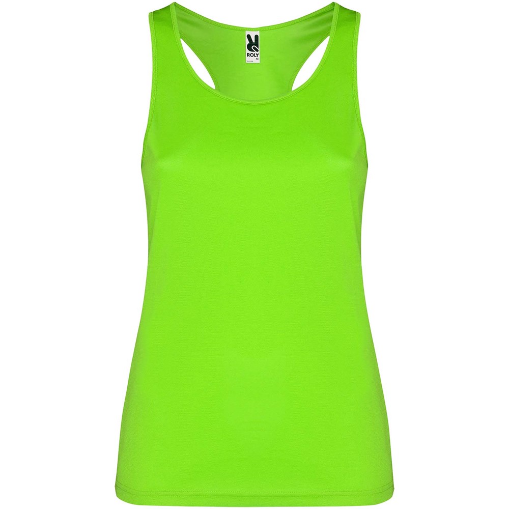 Technische, ademende, gemakkelijk te wassen en te drogen stof. Geribde armsgaten en halslijn. Racerback en zijnaden. Verwijderbaar label.