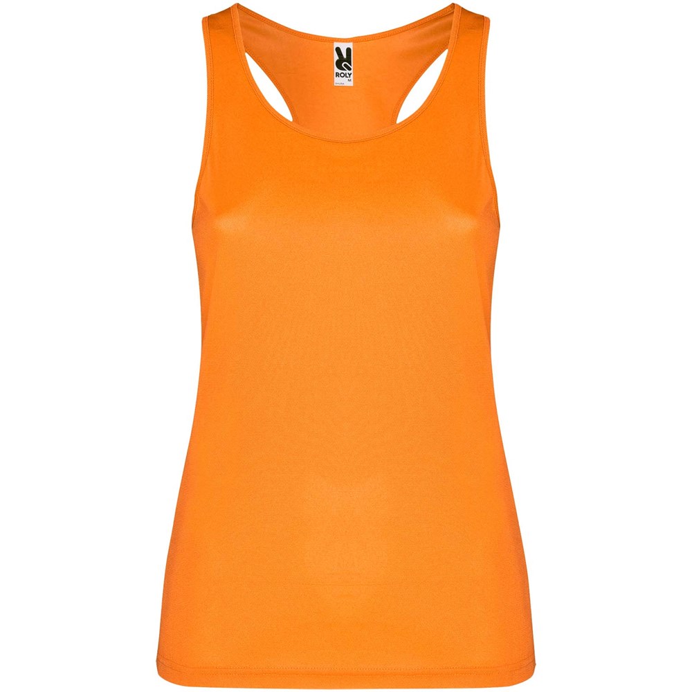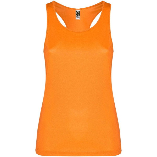 Technische, ademende, gemakkelijk te wassen en te drogen stof. Geribde armsgaten en halslijn. Racerback en zijnaden. Verwijderbaar label.