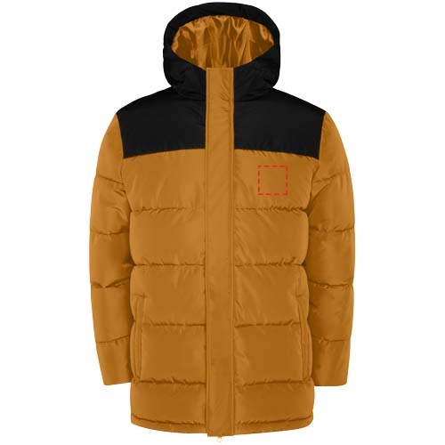 Gewatteerd jack met vaste capuchon. Rits aan de voorkant bedekt met een sluiting. Kinbescherming. Twee zijzakken met rits. Elastische manchetten.