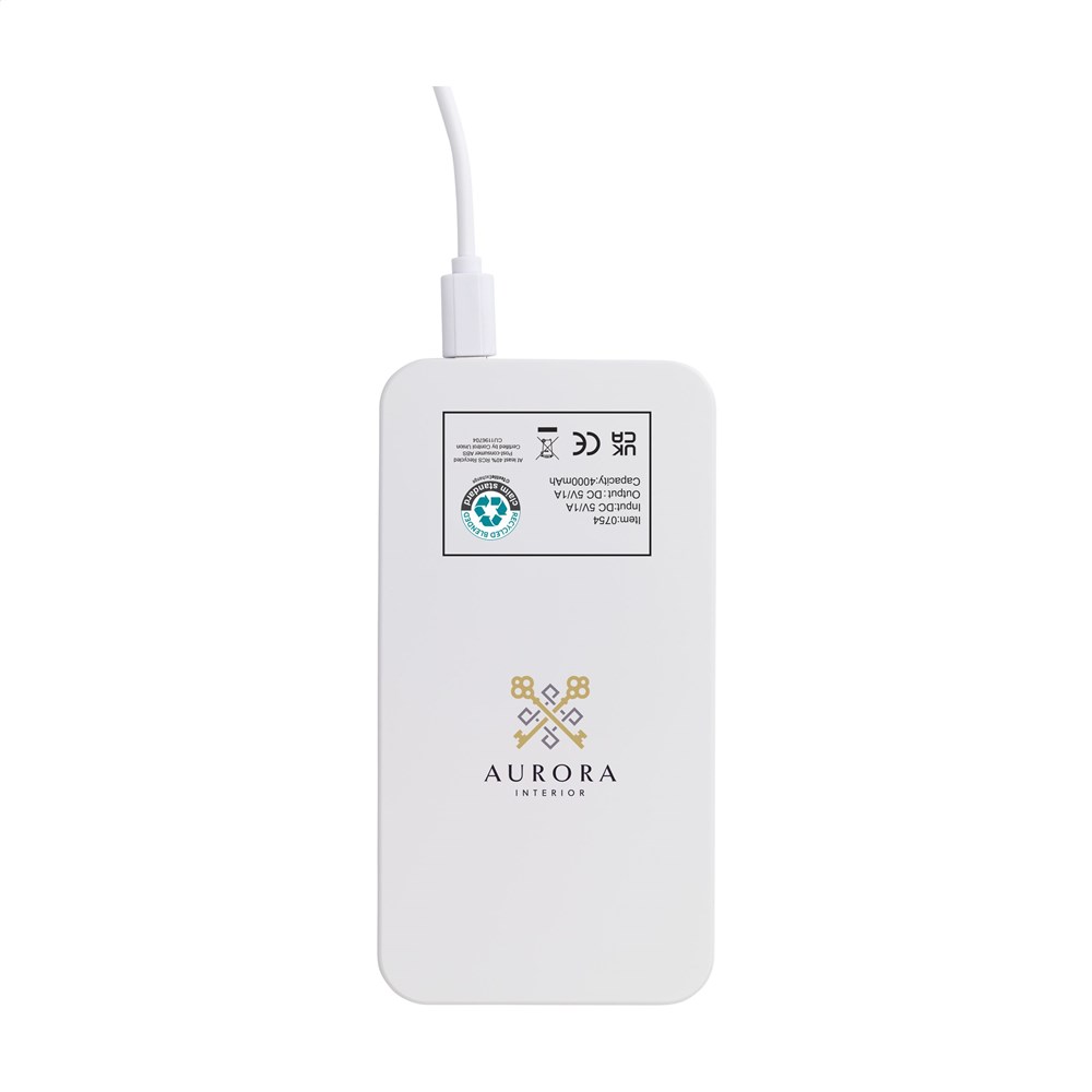 Krachtige, hoge capaciteit powerbank voorzien van solarpanel en ingebouwde, oplaadbare polymer batterij (4.000 mAh). Op te laden met zonne-energie of netstroom (d.m.v. USB poort). De behuizing is gemaakt van gerecycled ABS. Input: 5V/1A. Output: 5V/1A. Inclusief oplaadkabel met USB-C aansluiting, USB-C connector en gebruiksaanwijzing. RCS-gecertificeerd. Totaal gerecycled materiaal: 40%. Per stuk verpakt.