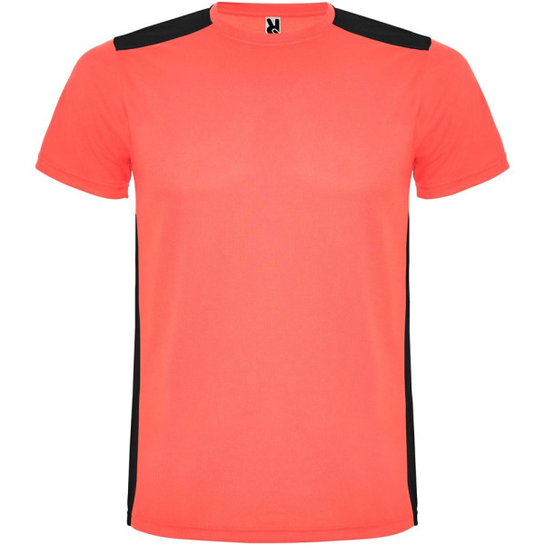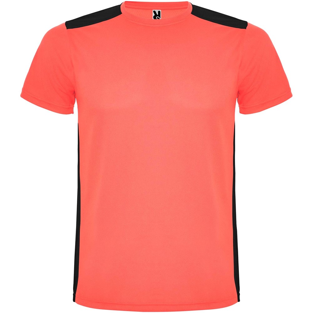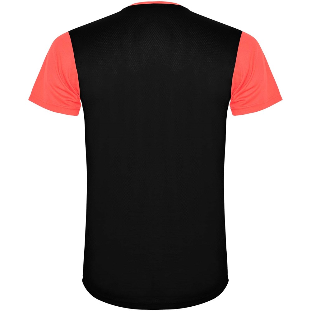Gemakkelijk drogende, technische en ademende stof. Ronde hals. Combinatie van twee polyesterstoffen op de rug en schouders. Birdseye-stof aan de voorkant en ademende 3D-meshstof aan de achterkant. Stof voorbereid voor vochtopname. Decoratieve zigzagsteek aan de zijkanten en schouders. Rugpatroon is iets langer. Verwijderbaar label.