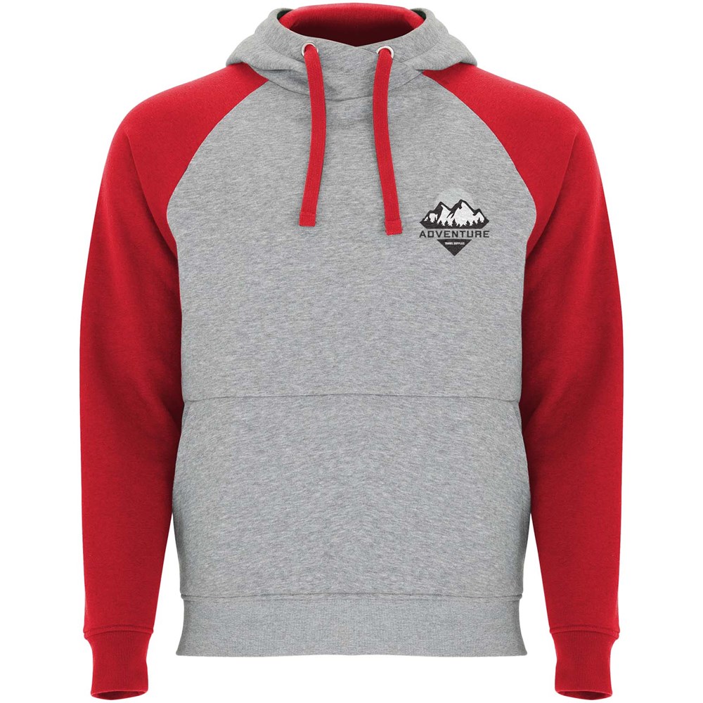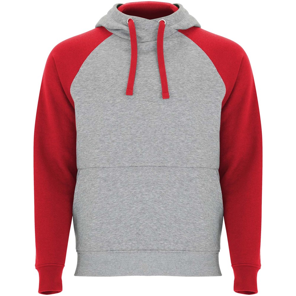 Tweekleurige unisex hoodie. Capuchon met gekruiste hals en metalen oogjes. Contrasterende binnenkant van de capuchon, trekkoord en raglanmouwen. Kangoeroezak. Manchetten en zoom van 1x1 ribgebreid elastaan. Verwijderbaar label.