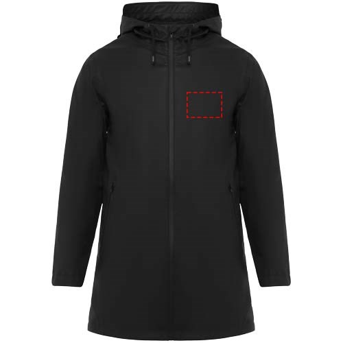 Waterdichte regenjas. Capuchon met klep. Door hitte gesealde ritsen en naden. Contrasterende details in zwart. Twee zijzakken met rits. Split aan de achterkant. Verwijderbaar etiket. Waterbestendig. Het model is 185 cm en draagt maat M.