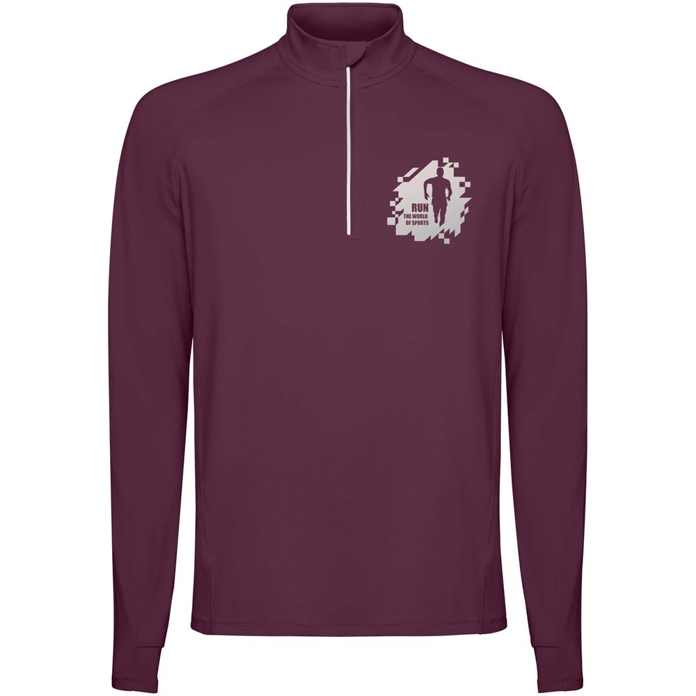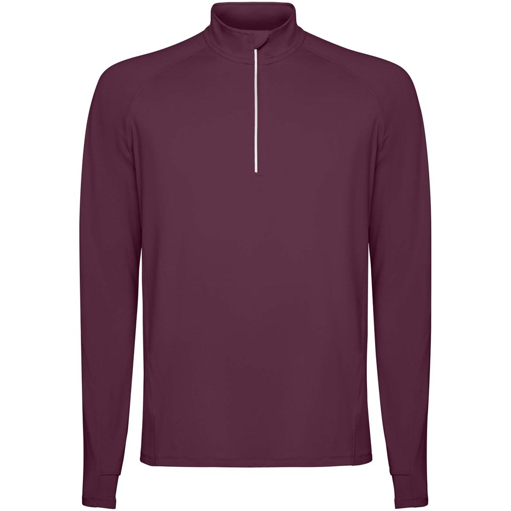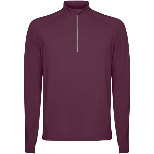 Technische raglan sweater met lange mouwen voor heren. Kraag met een halve rits en een omgekeerd ontwerp met reflecterende details. Verstevigde naden. Manchetten met duimopeningen. Reflecterende details op de achterkant. De zoom aan de achterkant is iets langer dan aan de voorkant. Warme geborstelde binnenstof.
