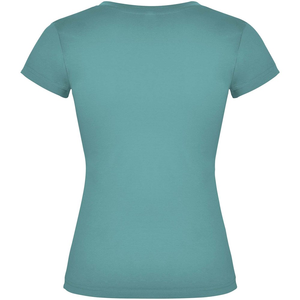 T-shirt met korte mouwen en V-hals voor dames, met 1x1 geribbelde afwerkingen. Slim-fit met zijnaden. Verwijderbaar etiket. Het model is 174 cm en draagt maat S.