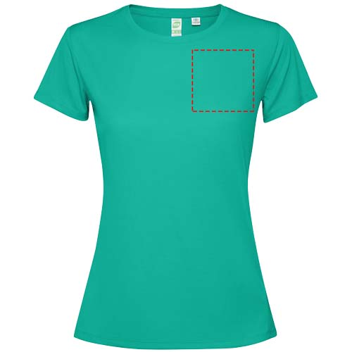 Getailleerd technisch T-shirt met korte mouwen voor dames. Kraag met bijpassende naden. De zoom aan de achterkant is iets langer dan aan de voorkant. Zijnaden naar voren verschoven.