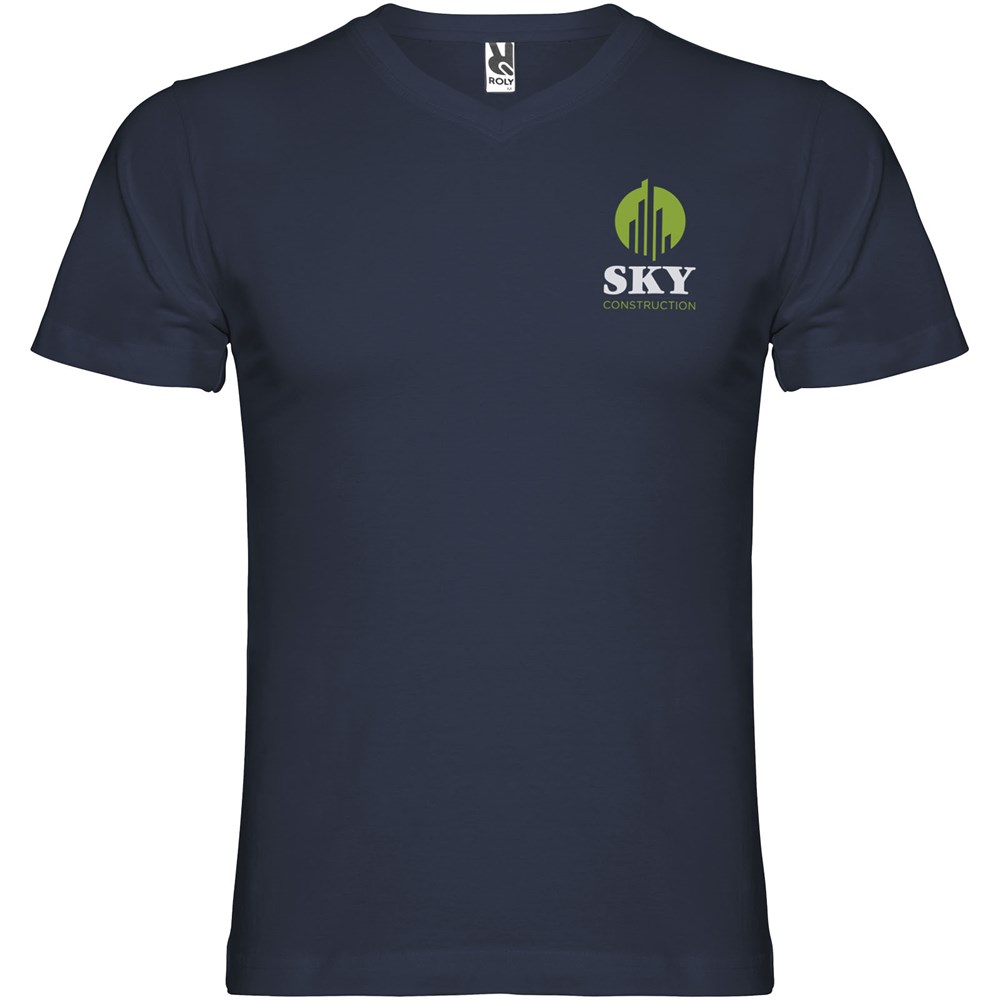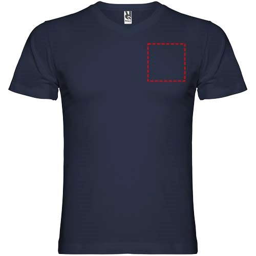 Buisvormig T-shirt met korte mouwen en tweelaags V-hals. Versterkte bedekte naden in kraag en schouders. Verwijderbaar etiket. Het model is 190 cm en draagt maat L.