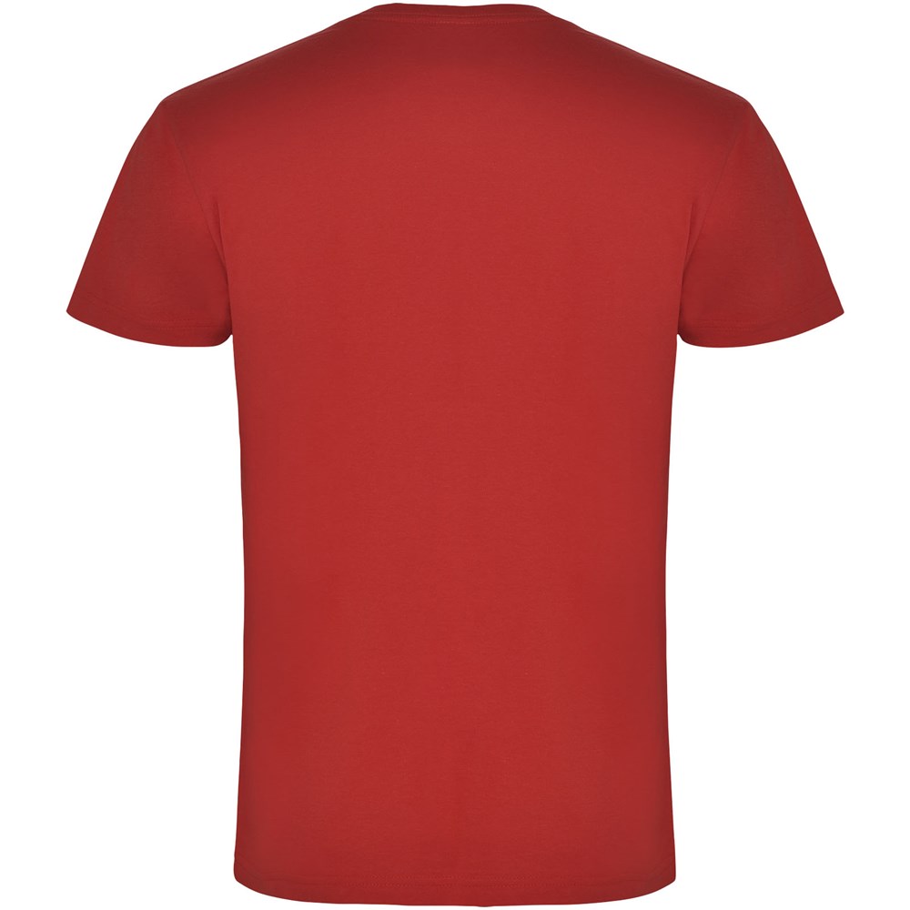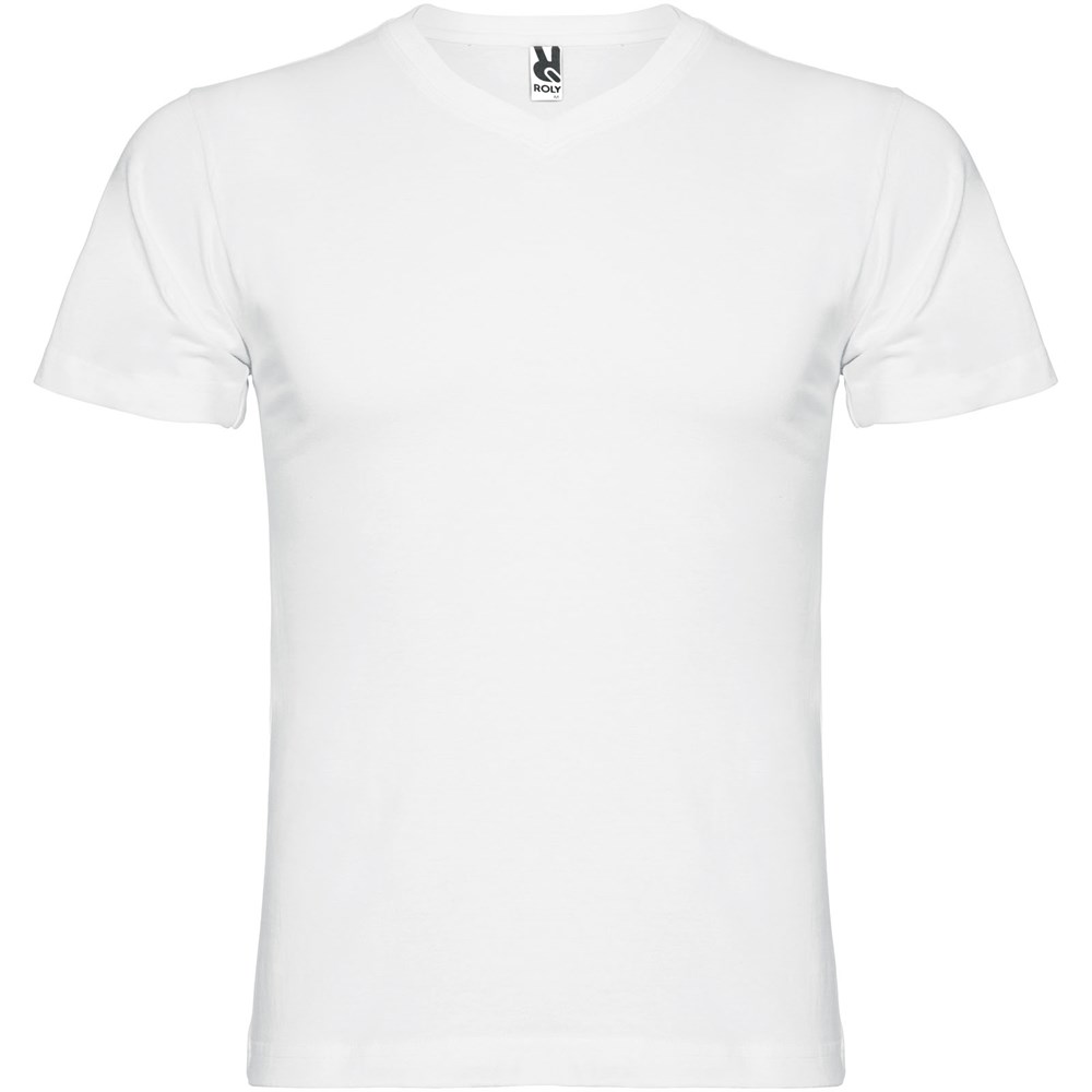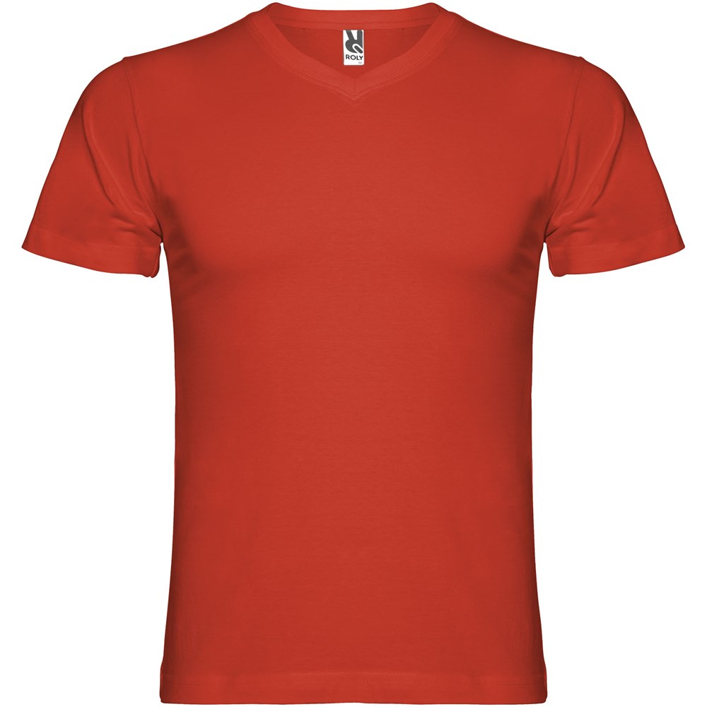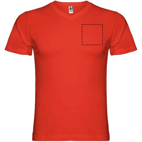 Buisvormig T-shirt met korte mouwen en tweelaags V-hals. Versterkte bedekte naden in kraag en schouders. Verwijderbaar etiket. Het model is 190 cm en draagt maat L.
