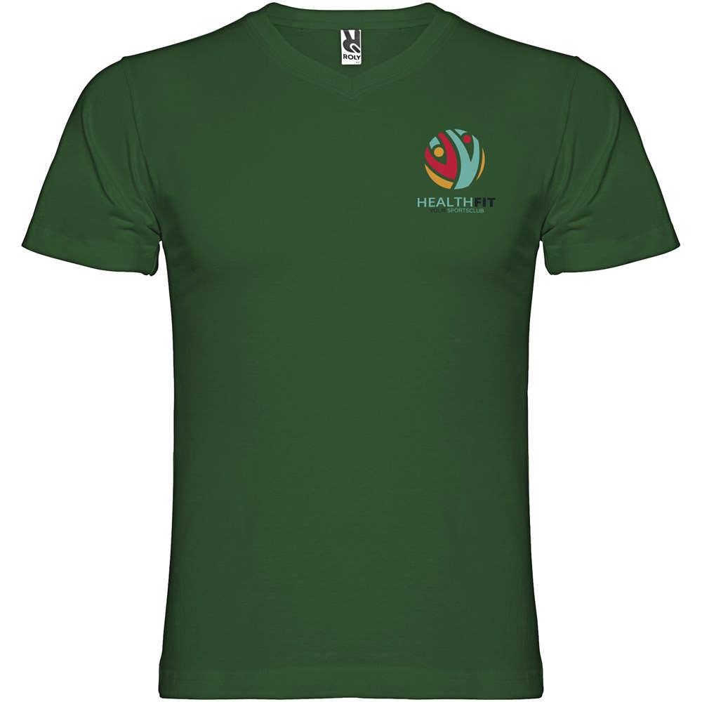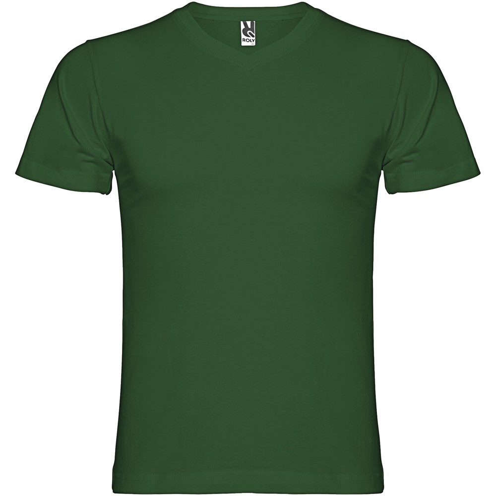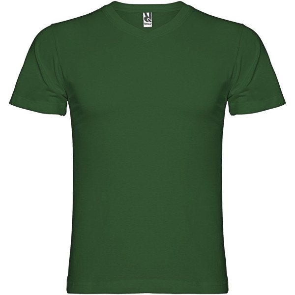 Buisvormig T-shirt met korte mouwen en tweelaags V-hals. Versterkte bedekte naden in kraag en schouders. Verwijderbaar etiket. Het model is 190 cm en draagt maat L.