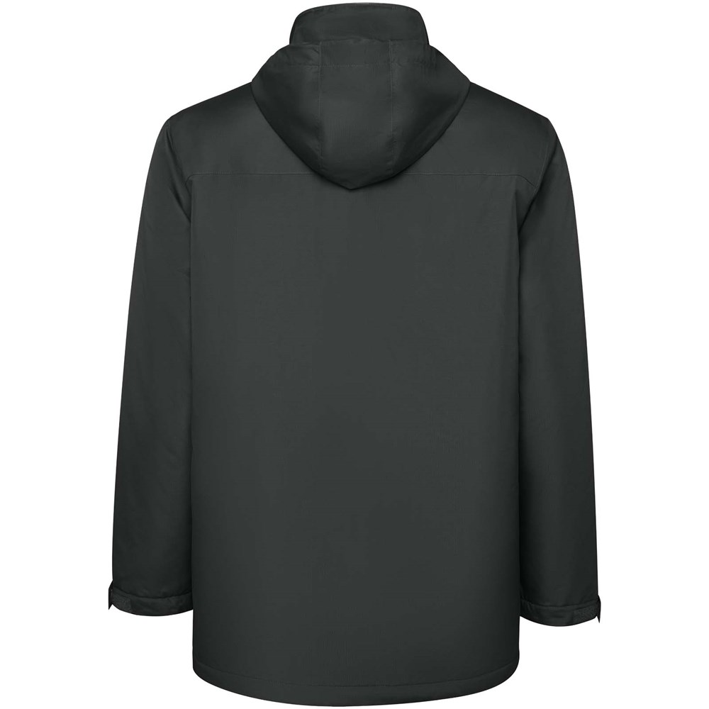 Waterdichte gewatteerde parkajack voor heren. Hoge kraag met omgeslagen en afneembare capuchon met klittenbandsluiting. Bijpassende centrale rits met flap. Zijzakken met rits en vaste klep. Binnenzak met klittenbandsluiting. Verstelbare manchetten met riemlus met klittenbandsluiting. Interne toegang voor verstevigingen op de rug en linkerborst.