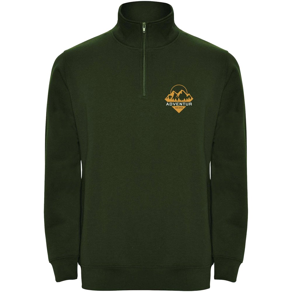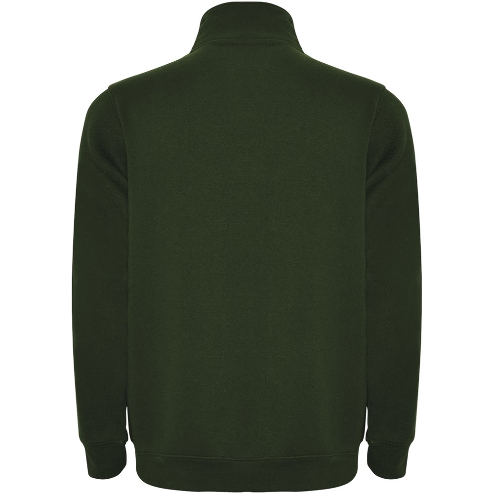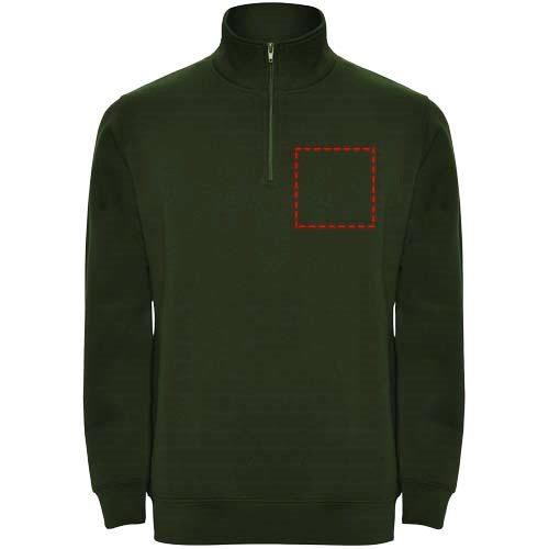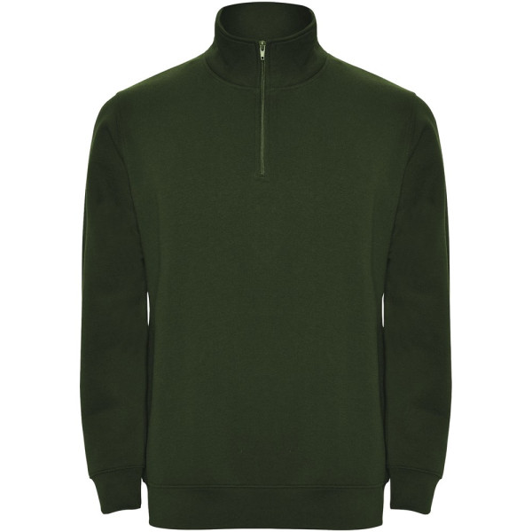 Sweatshirt met halve rits in dezelfde kleur en staande kraag. Binnenkant van de kraag in dezelfde kleur. Versterkte naadafdekkingen aan de binnenzijde van de kraag. Manchetten en tailleband in ribboord 1x1. Het model is 185 cm en draagt maat M.