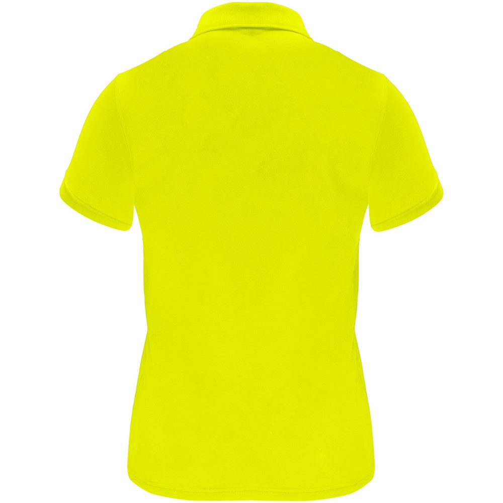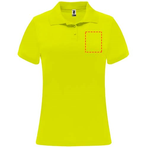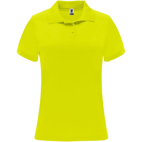 Technisch poloshirt met korte mouwen voor dames. Gebreide kraag met sluiting met drie knopen. Getailleerde snit. Ademende, gemakkelijk wasbare en droge stof. Verwijderbaar etiket. Technische stof. Ademende stof. Het model is 173 cm en draagt maat S.