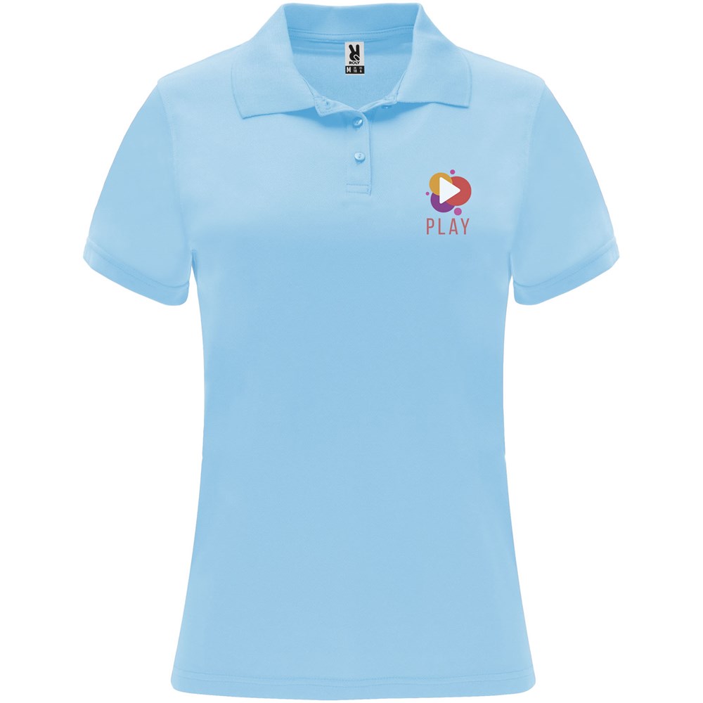 Technisch poloshirt met korte mouwen voor dames. Gebreide kraag met sluiting met drie knopen. Getailleerde snit. Ademende, gemakkelijk wasbare en droge stof. Verwijderbaar etiket. Technische stof. Ademende stof. Het model is 173 cm en draagt maat S.