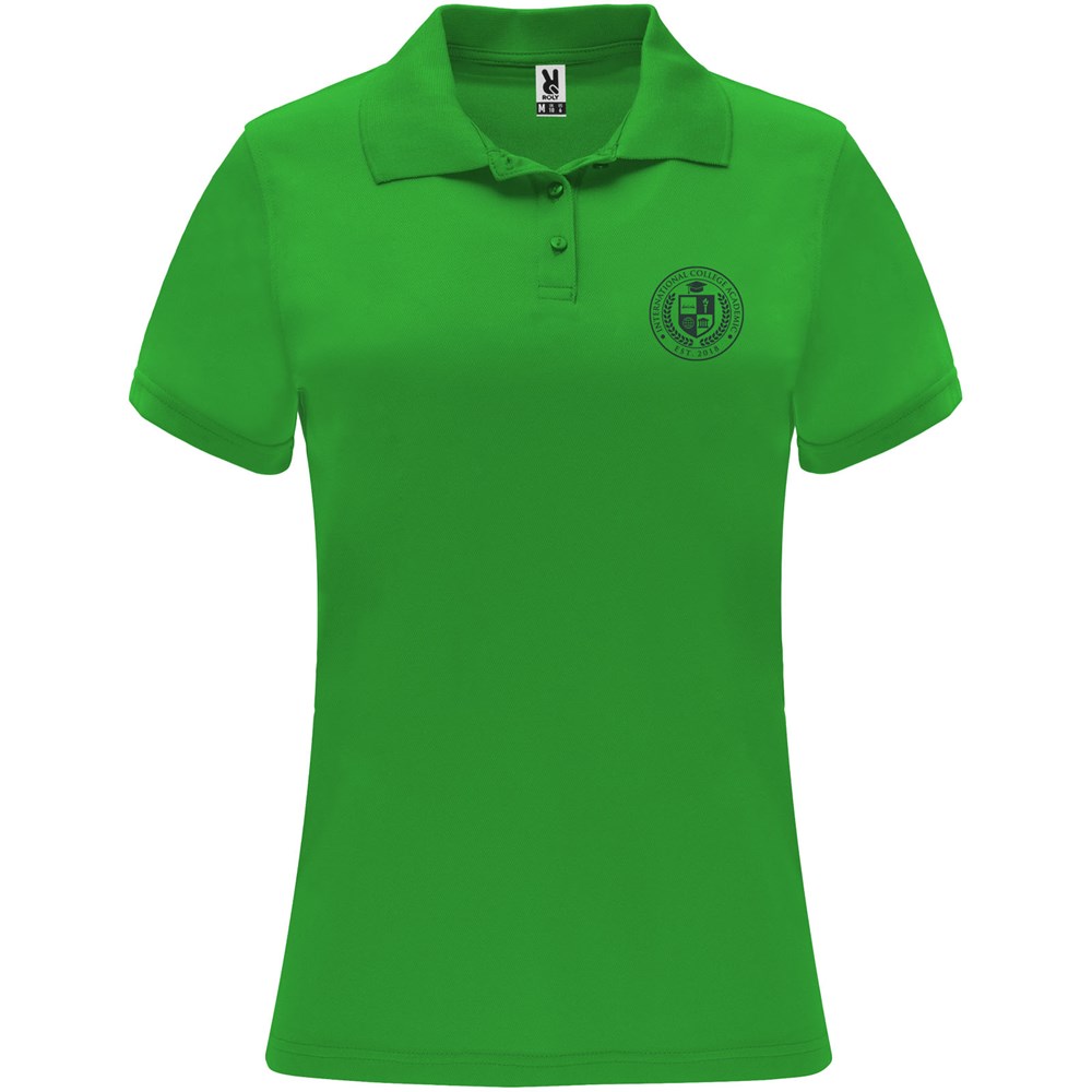 Technisch poloshirt met korte mouwen voor dames. Gebreide kraag met sluiting met drie knopen. Getailleerde snit. Ademende, gemakkelijk wasbare en droge stof. Verwijderbaar etiket. Technische stof. Ademende stof. Het model is 173 cm en draagt maat S.