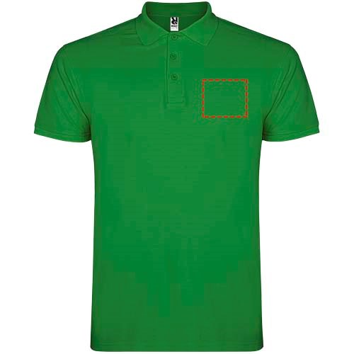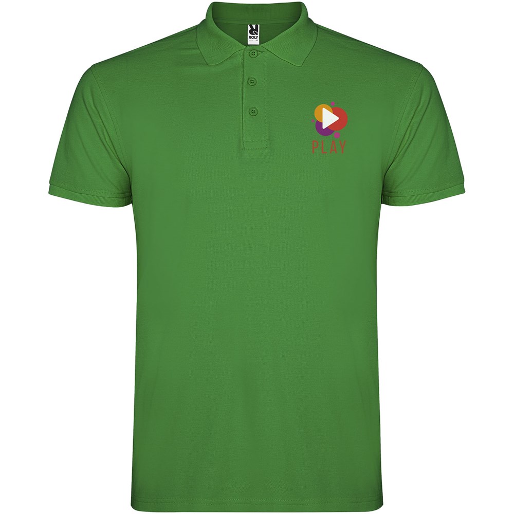 Poloshirt met korte mouwen voor kinderen. Versterkte bedekte naden in de binnenkant van de kraag. 1x1 geribde manchetten en kraag. Zijnaden. Knoopsluiting met drie knopen en zijsplitten. Optionele zak. Verwijderbaar etiket. Het model is 124 cm en draagt maat 5/6.