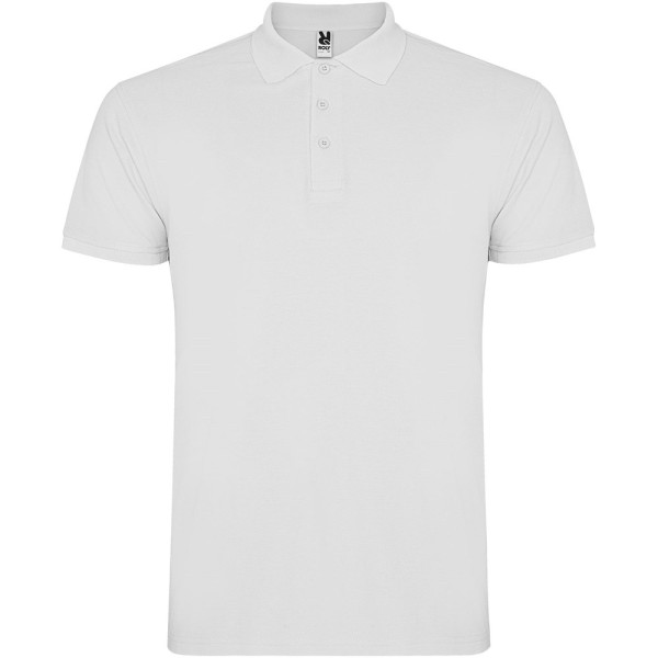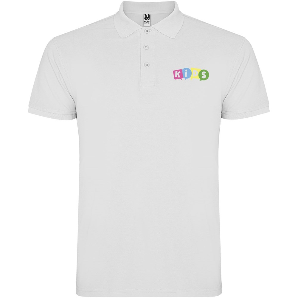Poloshirt met korte mouwen voor kinderen. Versterkte bedekte naden in de binnenkant van de kraag. 1x1 geribde manchetten en kraag. Zijnaden. Knoopsluiting met drie knopen en zijsplitten. Optionele zak. Verwijderbaar etiket. Het model is 124 cm en draagt maat 5/6.