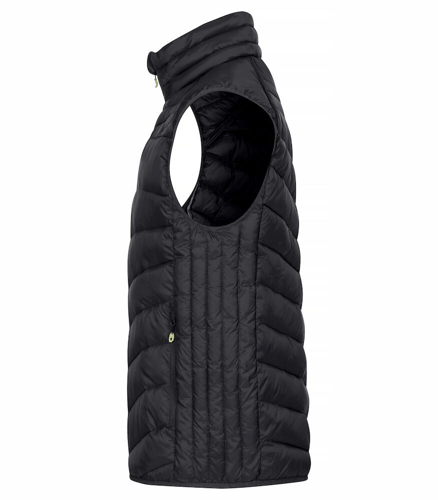 Een warm en toch lichtgewicht vest met donsachtige vulling gemaakt van 100% gerecycled polyamide. Voorzien van twee zijzakken en borstzak met rits en twee binnenzakken. De boord en armgaten zijn afgewerkt met een elastische band. Het damesmodel heeft een afneembare capuchon. Afgewerkt met doorvoer voor koptelefoon, ophanglusje in de nek en zipper puller in een contrasterende kleur.