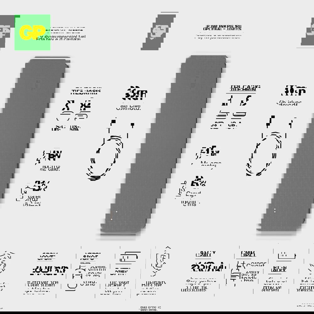 De GP Powerbank combineert betrouwbare stroomvoorziening met een stijlvol design. Met een capaciteit van 20.000 mAh kun je drie apparaten gelijktijdig opladen via 2x USB-A en 1x USB-C. De powerbank is uitgerust met een 8-voudige beveiliging voor veilig gebruik en een gegarandeerde lange levensduur. Ideaal voor professioneel en dagelijks gebruik.