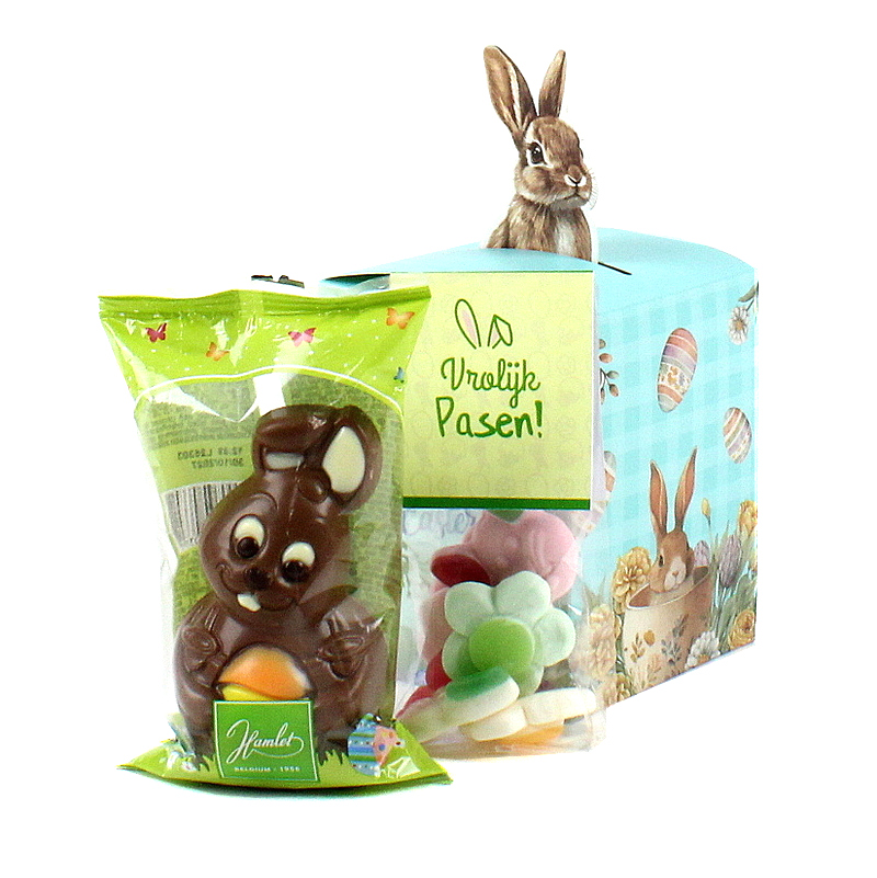Een vrolijk paasgeschenk dat altijd in de smaak valt. Deze feestelijke paasbox is gevuld met een heerlijke chocolade paashaas 55 gram en een zakje paassnoep 40 gram. De combinatie van chocolade en snoep maakt dit geschenk toegankelijk en geliefd bij jong en oud. Het is mogelijk om de kopkaart van het zakje paassnoep te personaliseren, bijvoorbeeld met een logo, naam of eigen paasboodschap. Vraag naar de mogelijkheden, wij denken graag met je mee. Besteleenheid: 24 stuks. Levertijd in overleg.