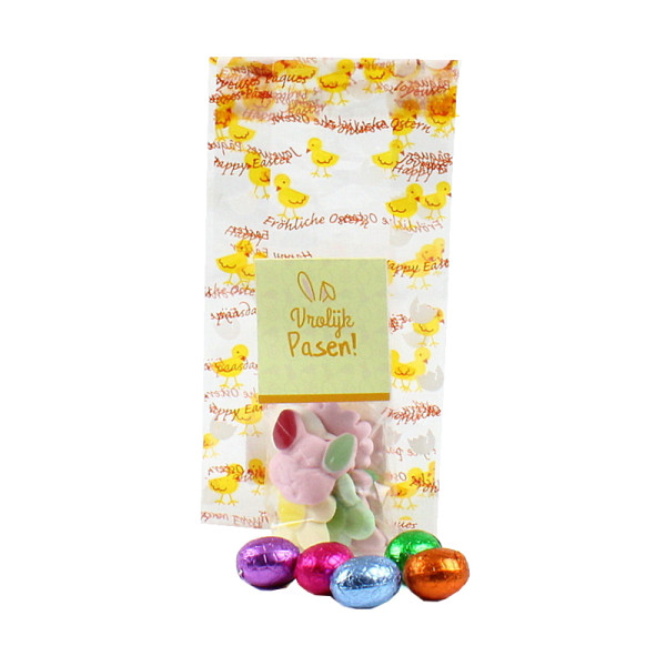 Een vrolijk paaszakje vol lekkers! Dit feestelijke plastic paaszakje met schattige kuikenprint is gevuld met heerlijk paassnoep 40 gram en 5 chocolade paaseitjes. Een kleurrijke en smakelijke traktatie die meteen een glimlach oproept. Het is mogelijk om de kopkaart van het zakje paassnoep te personaliseren, bijvoorbeeld met een logo, naam of eigen paasboodschap. Vraag naar de mogelijkheden, wij denken graag met je mee. Besteleenheid: 24 stuks. Levertijd in overleg.