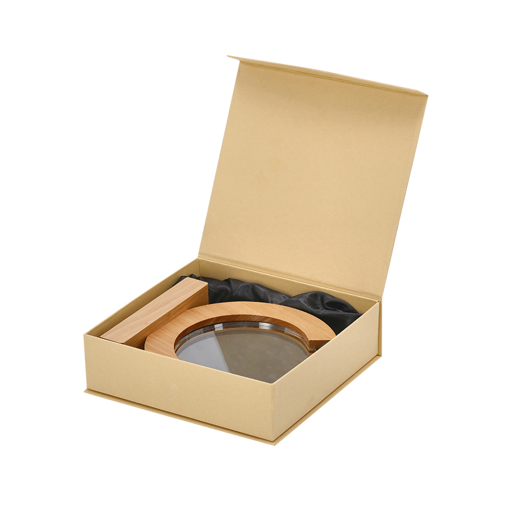 Trofeeënplaat van dik glas met een elegant rond ontwerp en een houten voet. Ideaal voor gepersonaliseerde cadeaus, erkenningen, prijzen en decoratie. Gepresenteerd in een individuele beschermkoffer in een Kraft-afwerking.