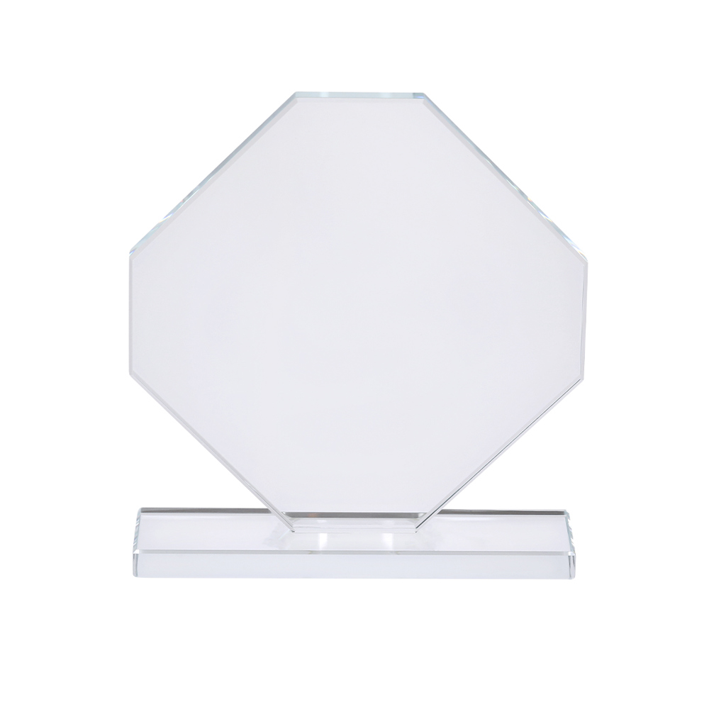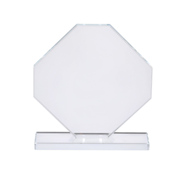 Trofeeplaat gemaakt van dik glas met een elegant achthoekig ontwerp met standaard. Ideaal voor gepersonaliseerde cadeaus, erkenningen, prijzen en decoratie. Gepresenteerd in een individuele beschermhoes in een elegant ontwerp.