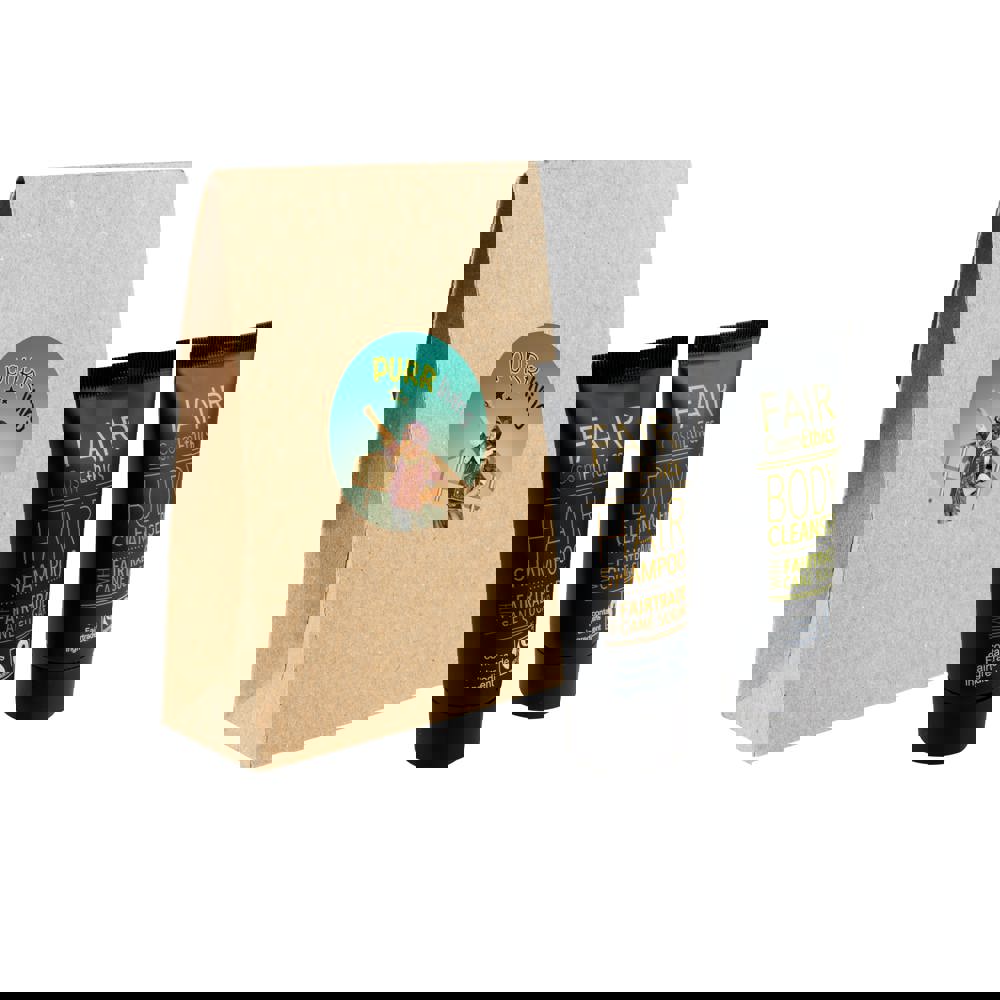 30 ml douchegel en 30 ml shampoo in een kraft stazakje.