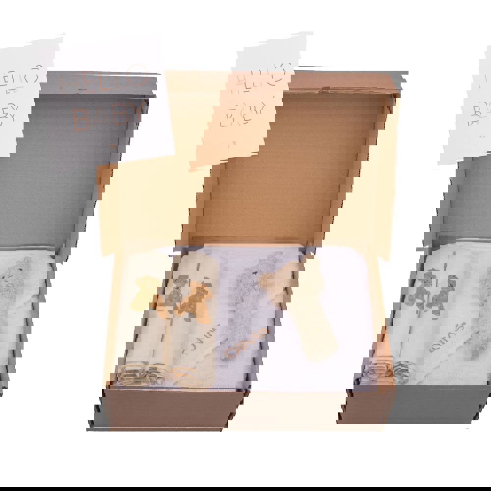 Geboorte cadeauset M inclusief gepersonaliseerde kaart, in samenwerking met Jollein. Bevat een witte badcape, een Teddy Bear rammelaar en 2 Teddy Bear hydrofieldoeken. Verpakt in een bruin doosje met Hello Baby etiket.