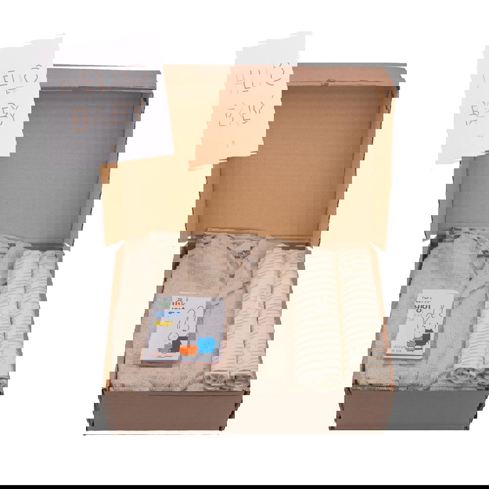 Nijntje geboorte cadeauset M inclusief gepersonaliseerde kaart, in samenwerking met Jollein. Bevat een Nijntje badjas, 2 Nijntje hydrofieldoeken en een Nijntje boekje. Verpakt in een bruin doosje met Hello Baby etiket.