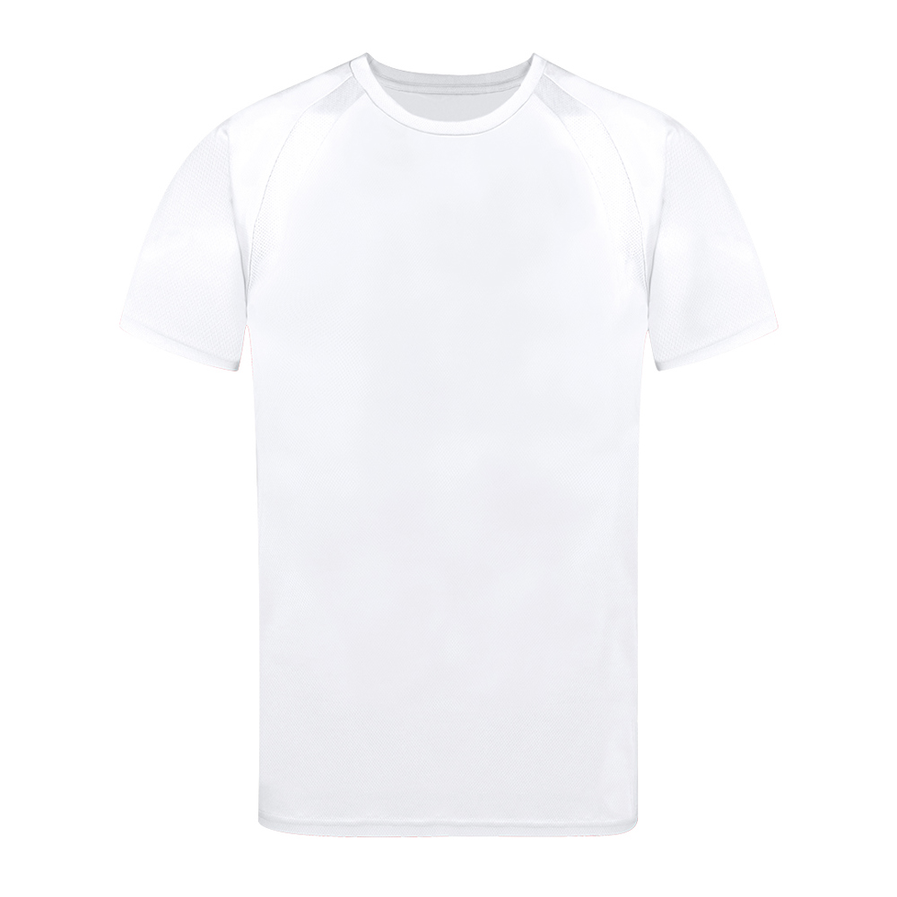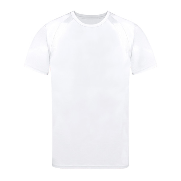 Technisch T-shirt voor volwassenen van 100% ademend polyester materiaal 135g/m2. Met raglanmouwen, ronde hals en banden aan de voorkant van ademende, micro-geperforeerde stof. Verkrijgbaar in de maten S, M, L, XL, XXL.