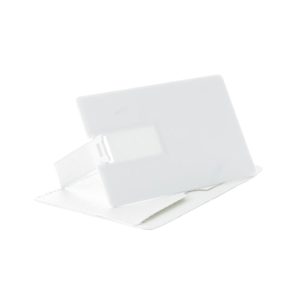 16 GB USB-stick. Ultraplat ontwerp, inklapmechanisme en speciaal ontworpen voor full color digitaal printen. Gepresenteerd in een elegante, individuele witte PU lederen tas.