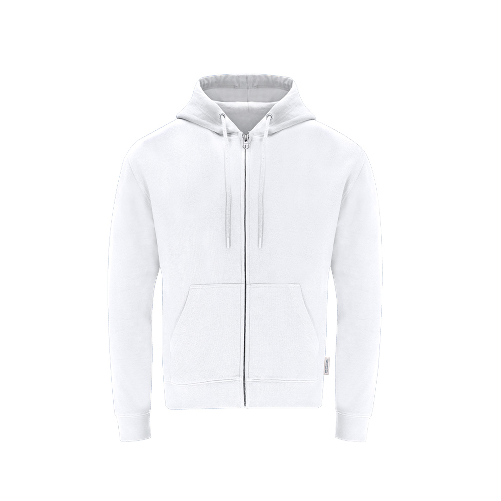 Unisex hoodie met rits van biologisch katoen en gerecycled polyester, in zacht fleece van 280 g/m². Met dubbele gevoerde capuchon, verstelbare ronde trekkoorden - met bijpassende stoppers - en metalen oogjes. Elastische ribgebreide manchetten en tailleband, en voorzak met kangoeroe-stijl. Verborgen metalen ritssluiting, met versterkte naadafdekking op de kraag. Inclusief opvallend ecologisch label.