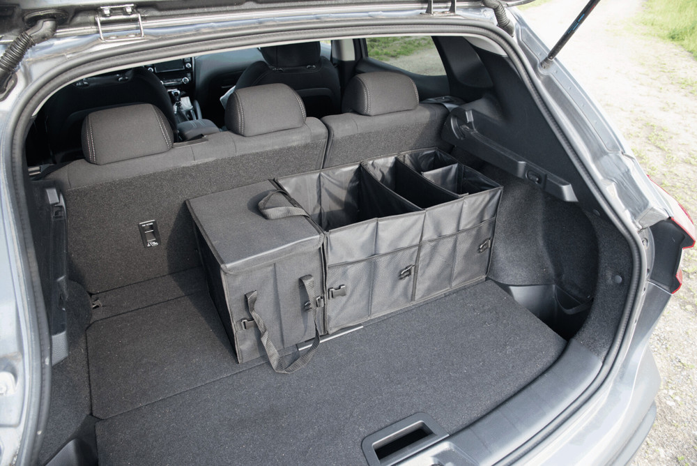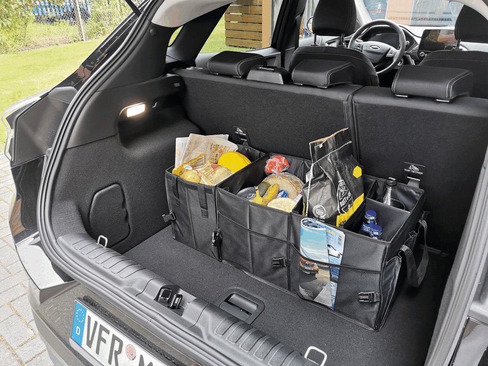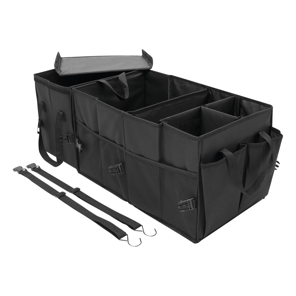 Kofferbaktas SUPER GADGET: opvouwbaar design, uitgevoerd uit 2 tassen die door klittenband met elkaar verbonden kunnen worden, 1 tas is voorzien van een deksel met handvat en 1 grote tas met 3 flexibele tussenschotten, handvatten, aan de zijkant 2 insteekvakken met aan de voorkant gaasvakken, versterkte bodemplaten, 2 gespen en talrijke clips. Klittenband op de bodem voor bevestiging in de kofferbak.