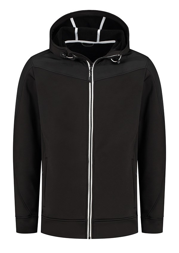 Lemon & Soda unisex jacket met capuchon en doorgestikte schouder en mouwstukken. Zakken met ritsen in de zijnaad. Contrast wit tape bij rits, binnenkant capuchon en contrast elastiek in de capuchon.
