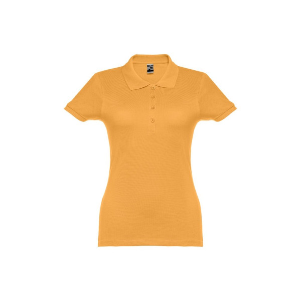 Damespolo met korte mouwen van 100% gekaard piqué katoen (195 g/m²) (kleur 183: 85% katoen/15% viscose). Bevat ribkraag en mouwen, de kraag is verstevigd met piquéband. Aan de voorzijde naast de kraag zitten vier bijpassende knopen (extra knoopje in de binnenzoom). Gesneden en genaaid stuk. Maten: S, M, L, XL, XXL