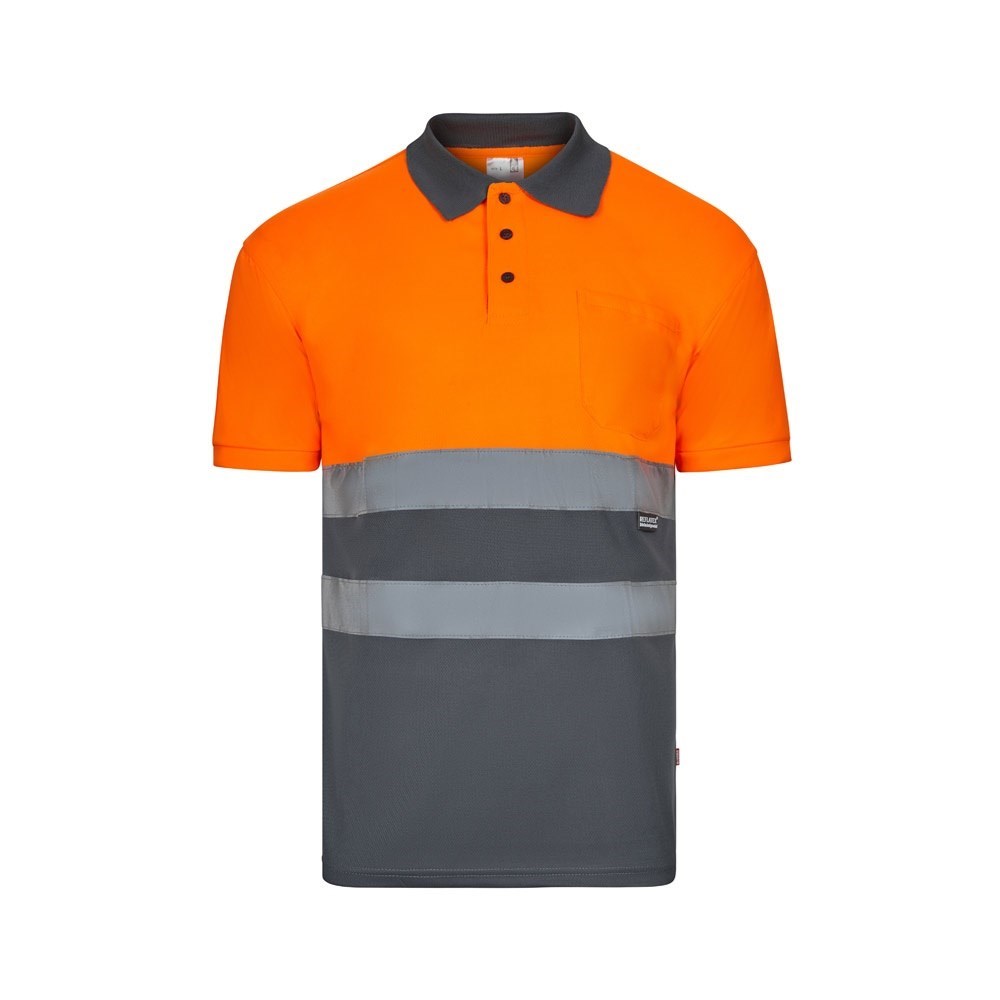 Tweekleurig bird-eye poloshirt (160g/m²) met korte mouwen, van polyester (100%). Contrasterende kleur knopen en kraag. Geribbelde kraag. Reflecterende strepen op de romp. Inclusief borstzakje. Product in overeenstemming met EU-verordening 2016/425, gecertificeerd door EN20471 en klasse Nº 1. Maat: 4XL, 5XL