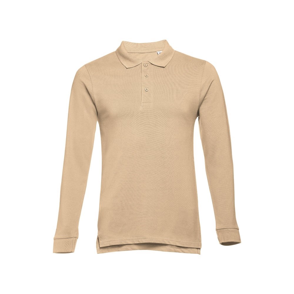 Herenpolo met lange mouwen van 100% gekaard piqué katoen (210 g/m²) (kleur 183: 85% katoen/15% viscose). Regular-fit polo met ribkraag en manchet knopen, de kraag is verstevigd met piquébreisel. Bevat een verstevigde kraag met 3 bijpassende knopen (extra knoop in de binnenzoom). Gesneden en genaaid stuk met openingen aan de onderkant. Met een verwijderbaar etiket. Maten: S, M, L, XL, XXL