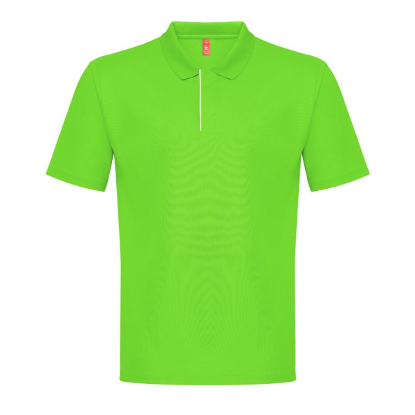 Technisch herenpoloshirt met korte mouwen in 100% gerecycled polyester piqué breisel (180 g/m²). Dit poloshirt heeft een 1x1 ribkraag en dubbele stiksels aan de mouwen en onderkant. Verstevigde sluiting met 3 gekleurde knopen afgewerkt in wit (behalve kleur 106 die is afgezet met zwart). Stuk gesneden en genaaid met kleine zijopeningen aan de onderkant van de polo en afgewerkt in wit (behalve voor kleur 106 die wordt gecontrasteerd met zwart). Maten: S, M, L, XL, XXL, 3XL
