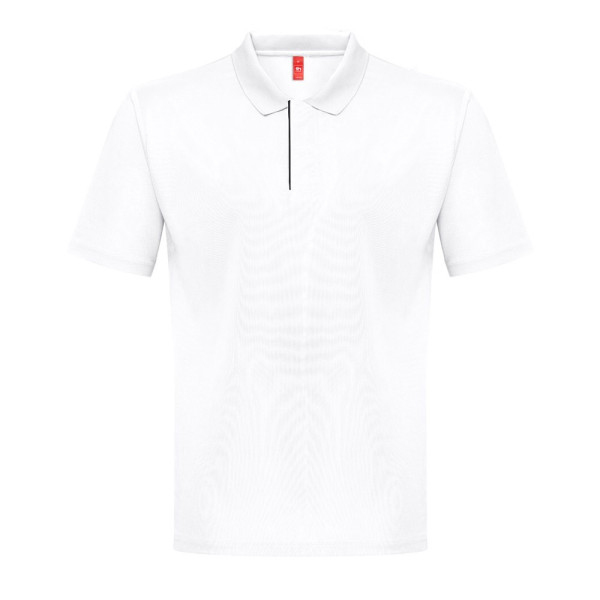 Technisch herenpoloshirt met korte mouwen in 100% gerecycled polyester piqué breisel (180 g/m²). Dit poloshirt heeft een 1x1 ribkraag en dubbele stiksels aan de mouwen en onderkant. Verstevigde sluiting met 3 gekleurde knopen afgewerkt in zwart. Stuk gesneden en genaaid met kleine zijopeningen onderaan de polo en afgewerkt in zwart. Maten: S, M, L, XL, XXL, 3XL