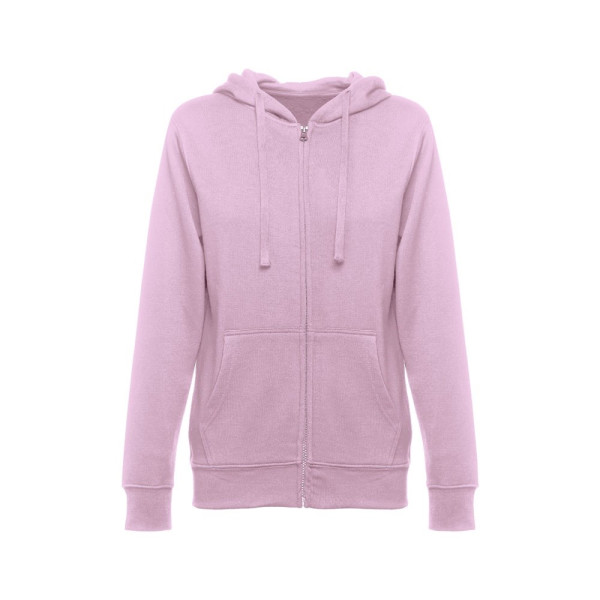 Dames sweatshirt van 50% katoen en 50% polyester (320 g/m²) met gekaarde binnenkant. De capuchon is gevoerd en bevat een gekleurde koordsluiting. Het voorste gedeelte heeft twee buidelzakken met een plastic sluiting. Stuk met manchetknopen en tailleband met elastiek. Maten: S, M, L, XL, XXL