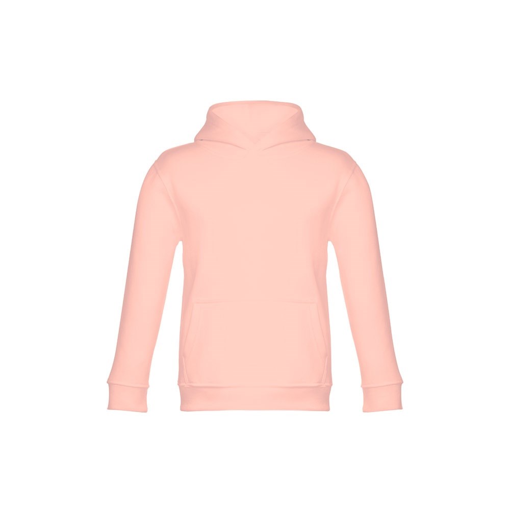 Sweatshirt met capuchon voor kinderen (unisex). Van 50% katoen en 50% polyester (320 g/m²) met gekaarde binnenkant. Met jersey gevoerde capuchon die voldoet aan de veiligheidsnormen van de Europese Unie. Sweatshirt met buidelzak en 1x1 rib mouwen en tailleband. Maten: 2, 4, 6, 8, 10, 12