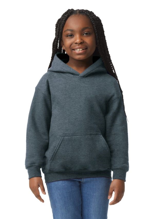 Gildan Heavy Blend Sweater met capuchon met buidelzak voor kinderen in de maten 104 t/m 176. Een populaire hoodie dankzij de uitstekende prijs-kwaliteitverhouding. Het verwerkte katoen in de sweater is van gecertificeerd U.S. Cotton. Het voldoet aan de CPSIA-vereisten.