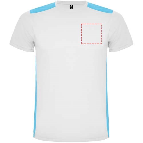 Gemakkelijk drogende, technische en ademende stof. Ronde hals. Combinatie van twee polyesterstoffen op de rug en schouders. Birdseye-stof aan de voorkant en ademende 3D-meshstof aan de achterkant. Stof voorbereid voor vochtopname. Decoratieve zigzagsteek aan de zijkanten en schouders. Rugpatroon is iets langer. Verwijderbaar label.
