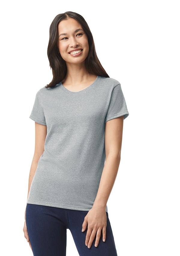 Gildan Heavy Cotton dames T-shirt met korte mouw. Het katoen wat in het shirt is verwerkt is van gecertificeerd U.S. Cotton. Door de comfortabele pasvorm en een goede prijs-kwaliteitverhouding perfect te gebruiken als basis T-shirt.