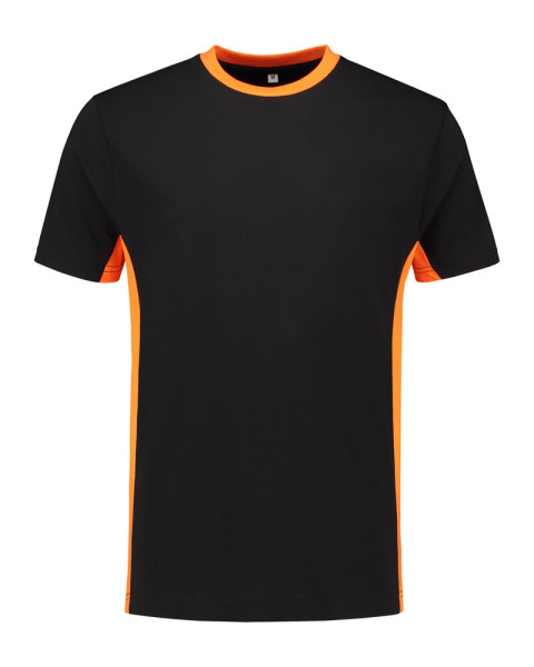 Lemon & Soda workwear unisex T-shirt met korte mouwen en ronde hals. Contrast kleuren bij de halsopening en zijkanten van het T-shirt. Behandeld met een bio-wassing voor extra glad oppervlakte.