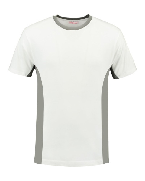 Lemon & Soda workwear unisex T-shirt met korte mouwen en ronde hals. Contrast kleuren bij de halsopening en zijkanten van het T-shirt. Behandeld met een bio-wassing voor extra glad oppervlakte.