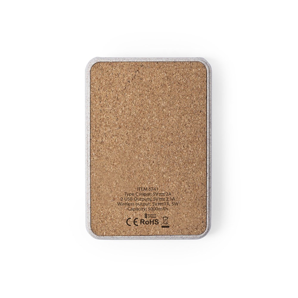 Externe natuurlijn hulpbatterij met geïntegreerde 5W draadloze oplader. Behuizing in combinatie van natuurlijke kurk en tarwestro materialen. 5.000 mAh capaciteit en laadstatus indicator. Dubbele USB-uitgang en Type C-ingang. Met groot drukoppervlak en gepresenteerd in een aantrekkelijke eco ontwerp doos. De getoonde capaciteiten in al onze externe hulpbatterijen zijn reëel, ze bevatten allemaal niet-gerecyclede, klasse A batterijen, met een levensduur van ten minste 500 laadcycli, en voldoen aan de CE-regelgeving. Bovendien zijn ze vervaardigd volgens RoHS-normen, en voldoen ze aan de volgende veiligheidseisen: Overlaadbeveiligingssysteem voor de powerbank. Volledig ontladingsbeveiligingssysteem, dat de duurzaamheid van de powerbank verhoogt. Blokkeersysteem om kortsluiting te voorkomen. Constant oplaadoverdrachtsysteem, in overeenstemming met de capaciteit van het doelapparaat.