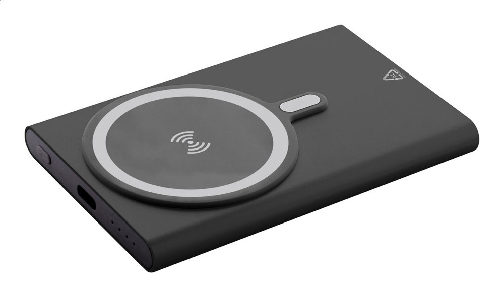 Powerbank van gerecycled aluminium met ingebouwde magnetische draadloze snellader (15 W) en 5000 mAh batterij. Met USB-C-ingang en oplaadpoort. Inclusief zelfklevende metalen ring om de magnetische functie op elk draadloos oplaadbaar apparaat te gebruiken. Compatibel met iPhone® 12 of nieuwer. Inclusief USB-oplaadkabel.