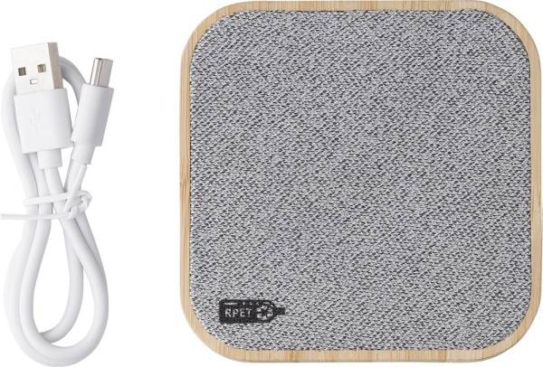 Bamboe draadloze oplader met rPET details. Snel opladen 15W. Individueel verpakt in een bruine kartonnen doos.